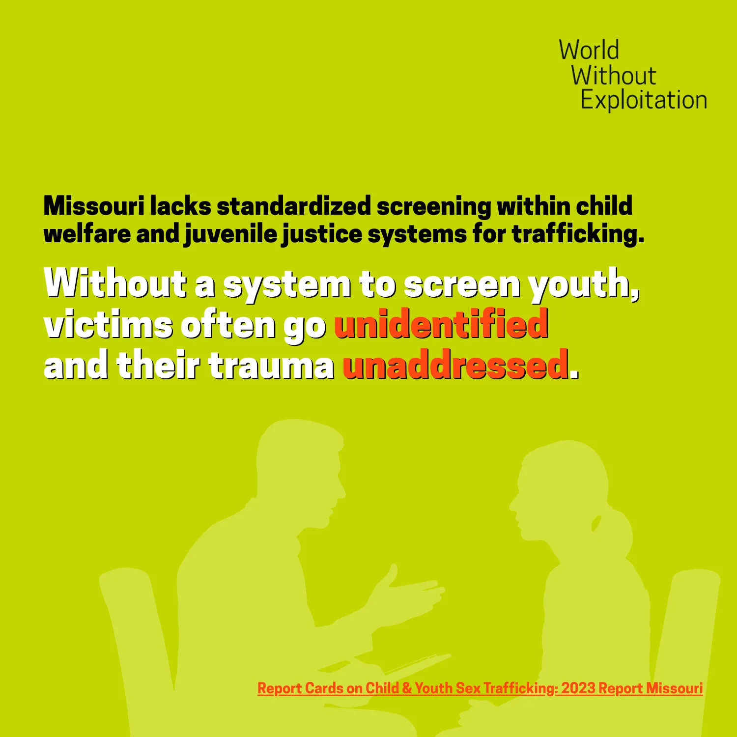 In Missouri, all aspects of the sex trade—whether selling sex, buying sex, promoting it, or profiting from it—are completely illegal.. Missouri has distinct laws for purchasing sexual services (patronizing and prostitution (selling sexual services). Missouri has a trafficking-specific law for criminal record relief, but it only applies to survivors who were minors at the time of their arrests, leaving most survivors without a criminal record relief option.